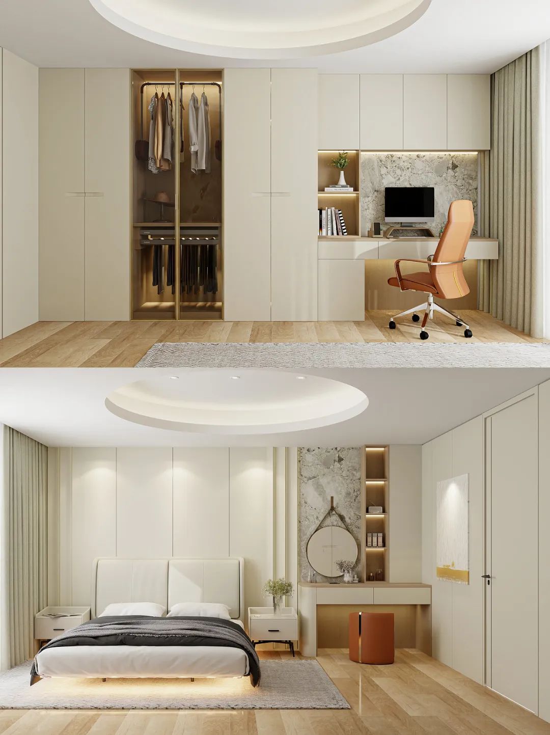 ??書桌柜與衣柜一體化設計,視覺效果更整體流暢,節省空間的同時也加大了儲物空間。