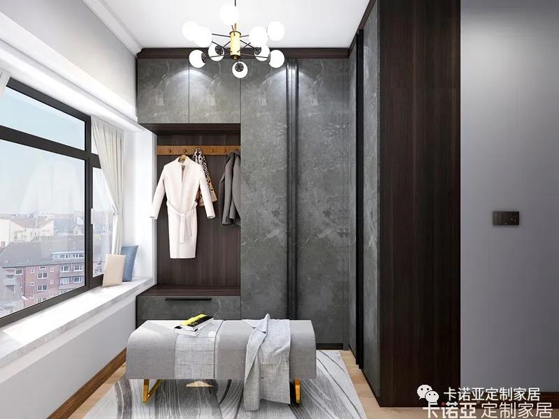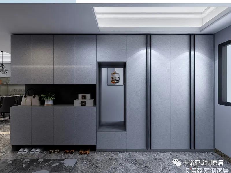 高級灰地柜+吊柜,柜體有藏有露,長條形玄關極致利用,收納性很強。為了方便出門整理儀容著裝,設計了一面試衣鏡,凹進去空間設置了換鞋凳。