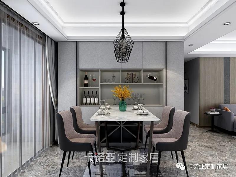 灰色系和粉色兩種撞色,柔和的燈光讓用餐環境更有格調。簡潔的餐桌搭配灰色餐邊柜,高低錯落,凹凸有致,讓餐廳更顯靈動。