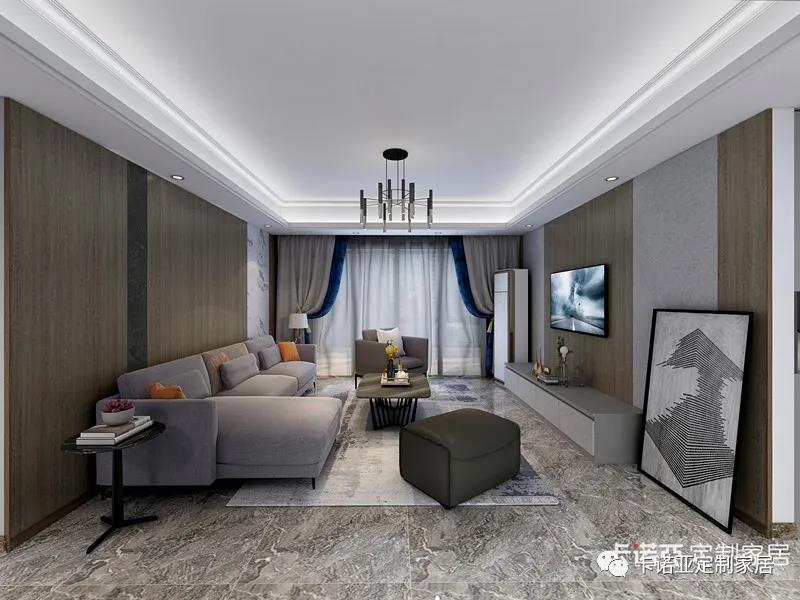 卡諾亞木光之城搭配黑金剛、漢白玉及灰姑娘組成的護墻板,在客廳里占據極其顯眼的位置,改變白墻的單一視覺。灰色一字型電視矮柜,與墻面遙相呼應。