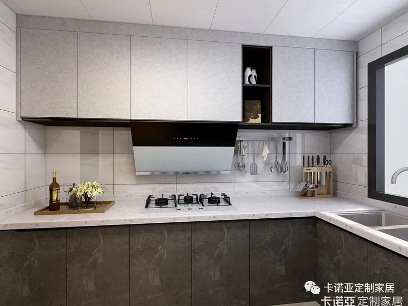 廚柜色彩采用撞色設計,吊柜采用淺灰的灰姑娘,地柜則是深灰的黑金剛,上淺下深,避免頭重腳輕,整體視覺簡約大氣。