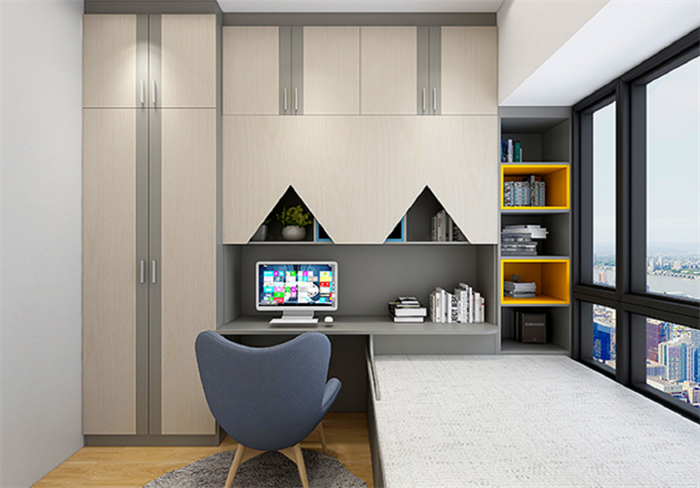 因為空間有限,所以兒童床直接做成了榻榻米,衣柜和寫字桌椅同樣是一體設計,這樣能更好的利用空間。