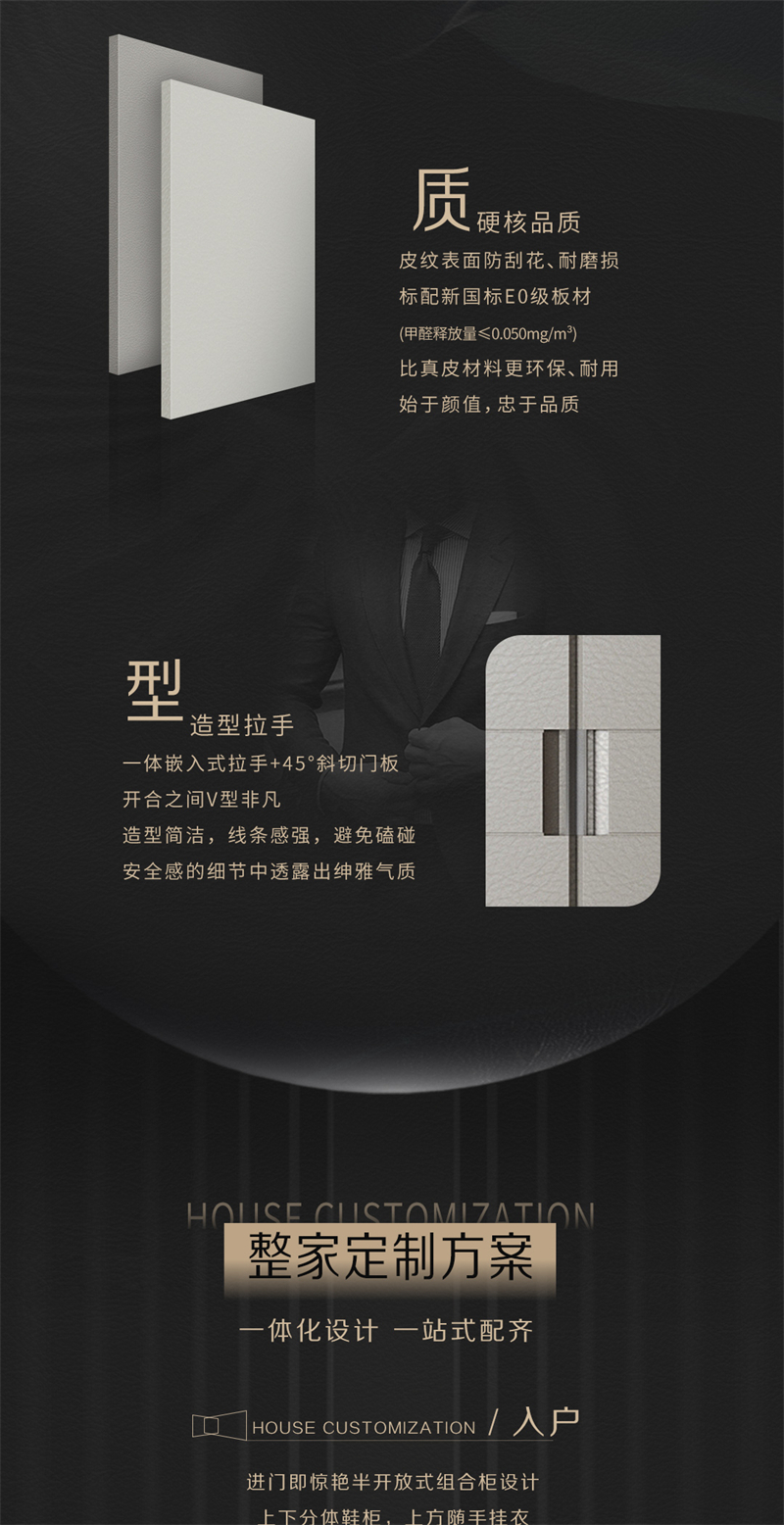 靈感來源于皮具奢侈品Hermes和LV 提取“H’元素勾勒門板簡潔腰線 結合'V'元素塑造門縫立體造型 采用高端皮質肌理打造極簡造型門板 簡奢有度優雅有品的生活拉開帷幕