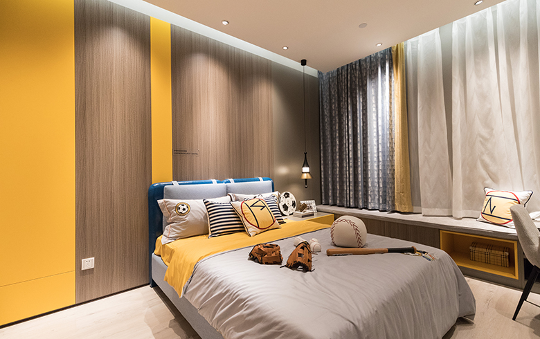 不同于普通的兒童房墻面采用油漆,本套空間的墻面加入了護(hù)墻板,除了營造簡潔明快的專屬兒童臥室特征之外,采用原木色與活力橙條紋相間的護(hù)墻板,清新健康,為整個(gè)空間增添了活力。