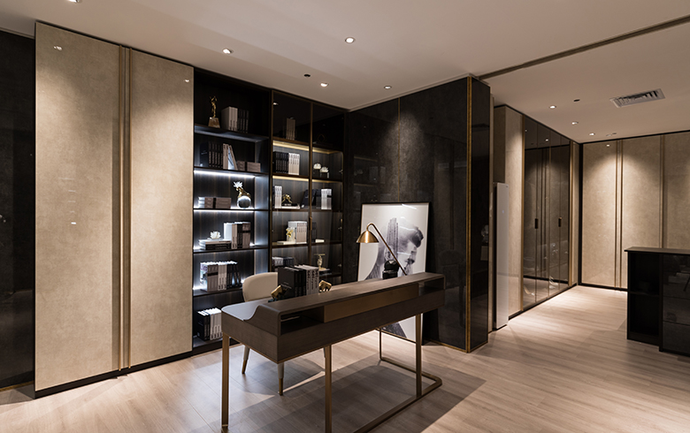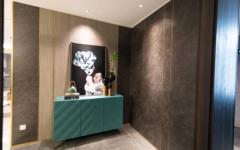 門廳護墻系統徜徉在經典與現代之間,行走在時尚的天平上,平衡著功能性與時尚美感,它是摩登而優雅的,將這種自然而富有美感的設計與傳統本土情懷結合,金屬黃銅線裝飾與木質天然紋理渾然一體,彰顯著華貴的生活氣息,低調而奢華。