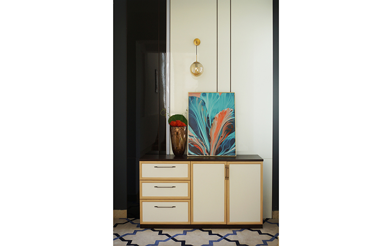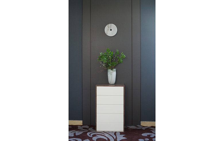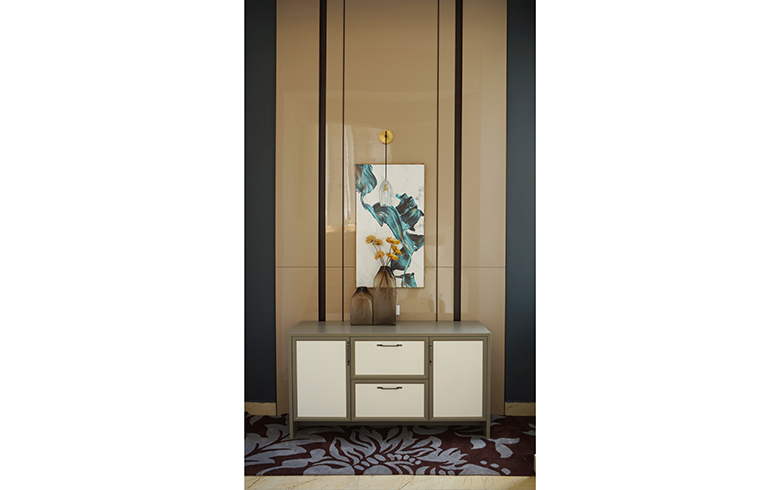 護(hù)墻板漢白玉的淺灰、墻面油漆的中性灰、大面積漢白玉護(hù)墻板拼貼的深色灰色塊,三種不同飽和度的灰和諧融合,白色點(diǎn)綴,演繹出美輪美奐的空間氣質(zhì),具有非常震撼的感染力。