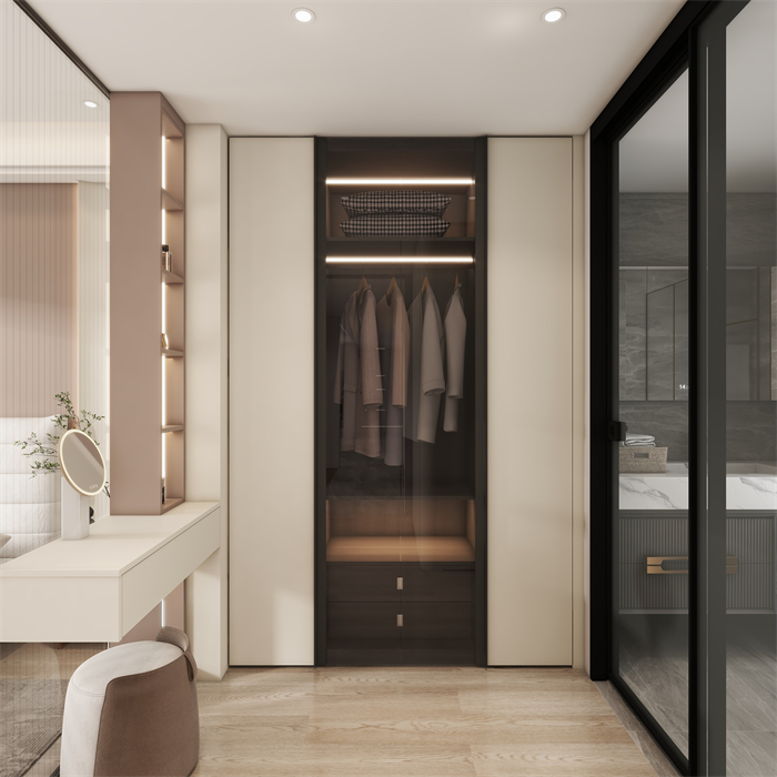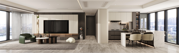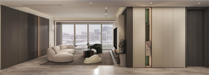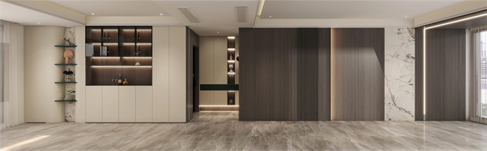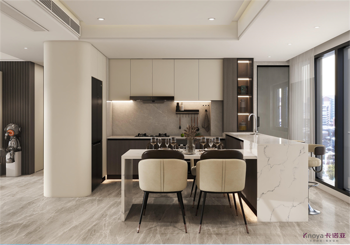 這是一個(gè)三口之家,客戶是都市精英人才,對(duì)生活充滿了熱愛,對(duì)品質(zhì)有著極高的要求,所以本方案主要以高級(jí)灰木紋色為主,搭配溫柔典雅的水性漆雅杏,給客戶營(yíng)造一個(gè)親近自然,同時(shí)又不失奢華的溫馨舒適的空間。廚房在原有的空間上做了一個(gè)大膽的改造,打造了一個(gè)中西結(jié)合的開放式廚房,空間更大,功能更齊全。同時(shí)一些墻角和柜體也做了圓弧設(shè)計(jì),動(dòng)線更加流暢的同時(shí),更顯時(shí)尚和高級(jí)。