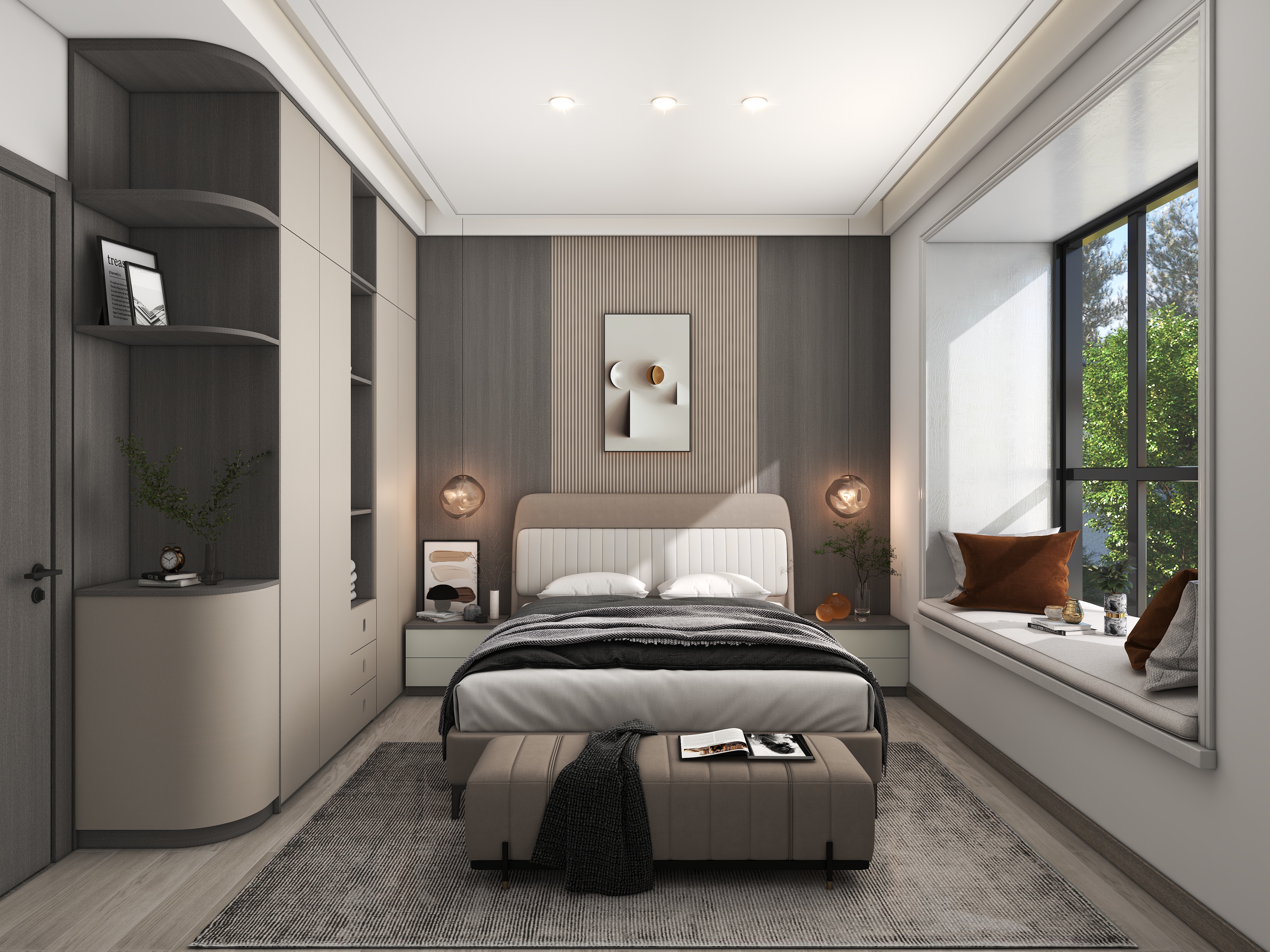 設(shè)計(jì)師為輕奢風(fēng)格的臥室定制了精致的到頂衣柜,還將衣柜分為三個(gè)區(qū)域,右邊為男女主人的衣物收納區(qū)域,左側(cè)設(shè)計(jì)成梳妝區(qū)域,飄窗則為閱讀休閑區(qū)域。