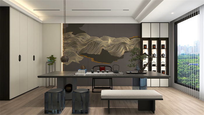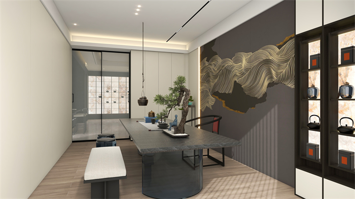茶室:打破傳統(tǒng)對稱均衡,一側(cè)一門到頂封閉柜,一側(cè)半開放式設(shè)計,既彰顯東方韻味,又為視覺做減法,簡單大雅。玻璃的通透與木紋的肌理相互交融,剛?cè)嵯酀露呒墶?/span>