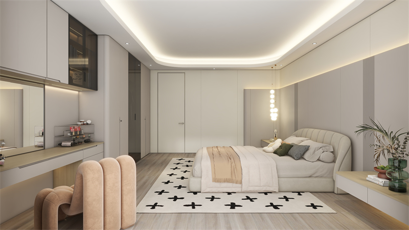 打破傳統墻面直線條的常規設計,圓弧護墻板以更柔和的曲線語言,勾勒臥室的柔美與靜謐,搭配奶油色系軟裝,簡單耐看,營造深度睡眠的舒適環境。