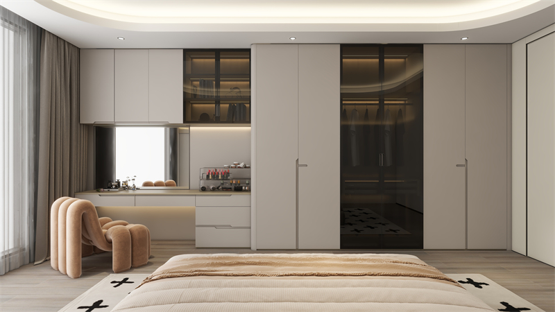 一門到頂衣柜,嵌入式梳妝臺一體化設計更省空間,在滿足衣物收納的同時,亦解決日常美妝、辦公學習的需求。