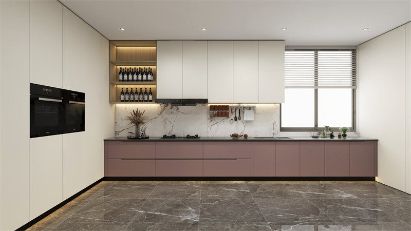 針對廚房潮濕高溫的特殊環境,櫥柜采用噴粉定制柜,360°環繞防潮覆蓋,耐黃不變色,樹脂粉末高溫固化,色彩更耐看,打造高級溫柔的廚房。“藕粉”與“白芷”搭配,溫暖柔和的色調,清新唯美的廚房空間,實現功能和美觀的統一,讓下廚時光變得優雅從容。