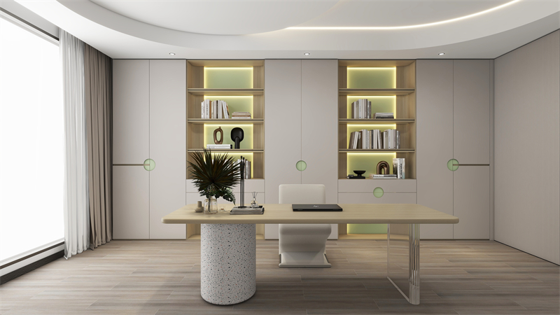 書房以溫馨的白色調為主,增添濃郁的溫暖氛圍,讓人沉浸于書香墨韻之中。綠意盎然的“夏檸”作為點綴色,清新脫俗的配色,宛如春風拂面,帶來生機勃發感,讓工作學習輕松愉悅。