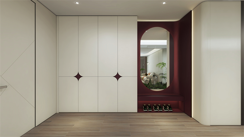 圓弧形的轉折處理,使得玄關區域在視覺上更加流暢與連貫,宛如自然延伸出的一個優雅弧度,引領家人順暢步入家中。下方保留開放式常換鞋區,簡潔實用;圓弧拼接門型搭配“白芷”、“紅鸞”撞色點綴,打破傳統色彩界限,賦予空間柔和而深邃的視覺層次。