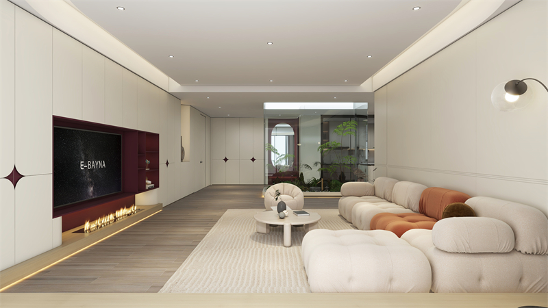 懸空電視柜撞色設計,搭配弧狀拼接護墻板,保留奶油風溫馨基調又增添幾分和諧且富有層次感的視覺效果,讓空間輕盈靈動。