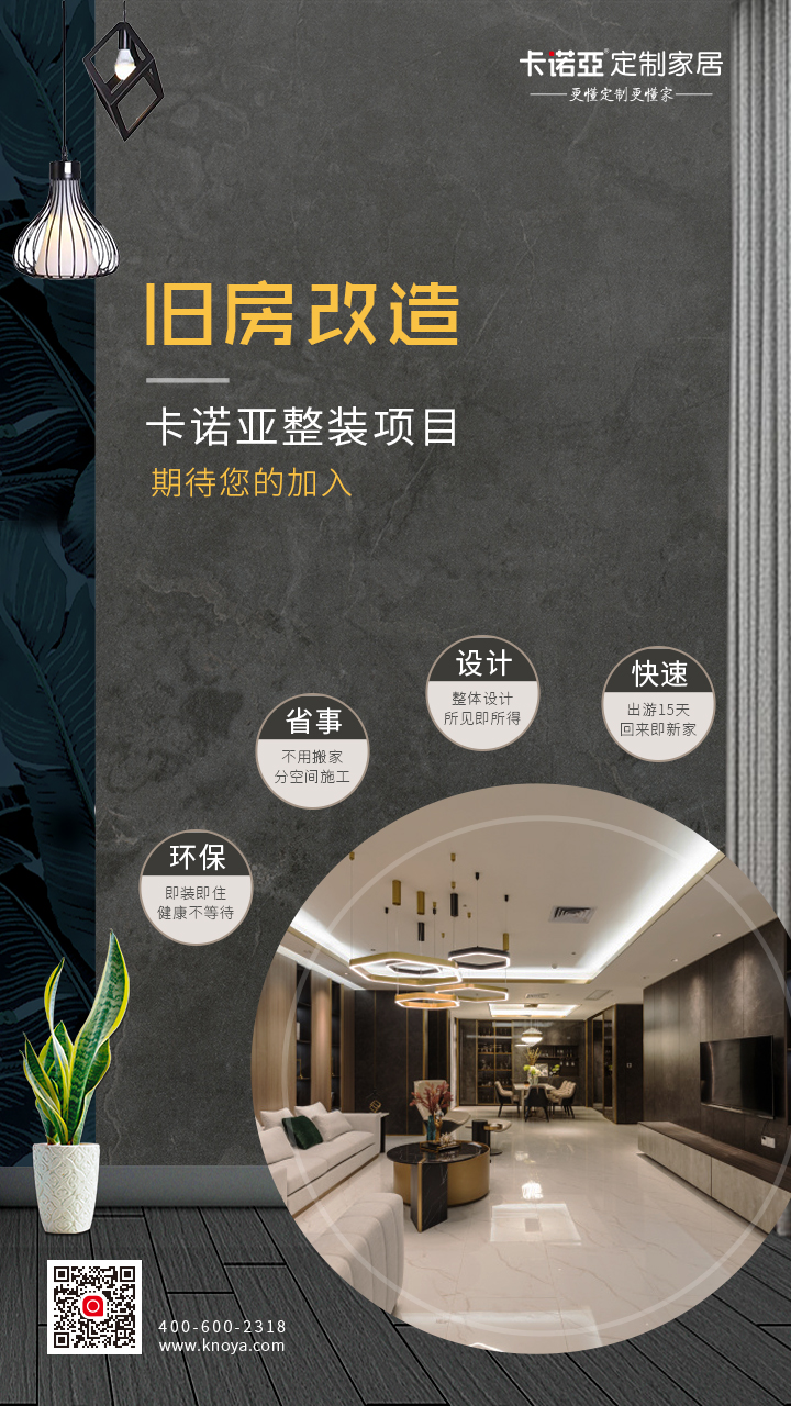 為了做到讓廣大業主在舊房改造上省錢省事,卡諾亞推出了一站式空間定制-整裝項目:【快速】出游15天,回來住新家;【設計】整體設計,所見即所得;【省事】不用搬家,分空間施工;【環保】即裝即住,健康不等待。