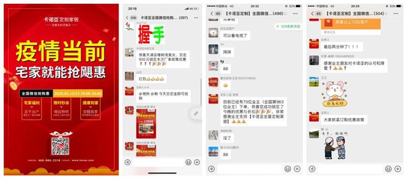 同時(shí),卡諾亞積極探索未來競爭新模式。2月13日/15日,籌備半個(gè)月的全國微信搶購惠爆破活動(dòng)線上落地,眾志成城、攻城略地,在營銷和運(yùn)營推廣團(tuán)隊(duì)的積極動(dòng)員、強(qiáng)力執(zhí)行之下,全國各戰(zhàn)區(qū)微信群爆滿,客戶下單不斷,銷售業(yè)績突破新高,實(shí)現(xiàn)了卡諾亞2020年開年的首戰(zhàn)告捷!