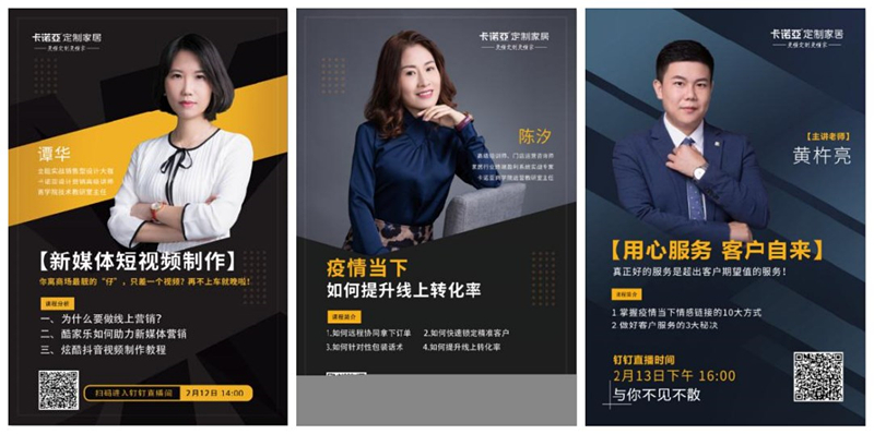 2月初,卡諾亞全面啟動(dòng)線上辦公模式,通過釘釘App、微信直播、企業(yè)OA等部署和開展工作。營銷中心渠道部、招商部、商學(xué)院、大客戶部、軟裝事業(yè)部、市場部等部門線上工作統(tǒng)籌規(guī)劃啟動(dòng),其他各部門也在積極推動(dòng)線上工作進(jìn)程,以便積極響應(yīng)經(jīng)銷商的各種需求,商學(xué)院積極組織培訓(xùn)課程,讓經(jīng)銷商和員工充分利用好假期,為復(fù)工做好準(zhǔn)備。