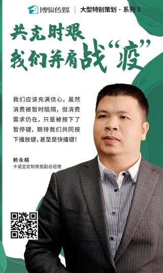 疫情之下,卡諾亞聯(lián)手家居行業(yè)上下游產(chǎn)業(yè)鏈各種資源,為中國家居提振信心助威吶喊,為戰(zhàn)勝疫情一起加油!卡諾亞定制家居副總經(jīng)理兼營銷中心總經(jīng)理賴永精、營銷中心副總經(jīng)理李偉明分別接受媒體采訪,與多家媒體聯(lián)合發(fā)聲,和眾多家居企業(yè)一起并肩戰(zhàn)“疫”,呼吁同行積極思考、理性經(jīng)營,專注做好自己的事情,提高企業(yè)疫情危機(jī)下的免疫力和綜合競爭力。