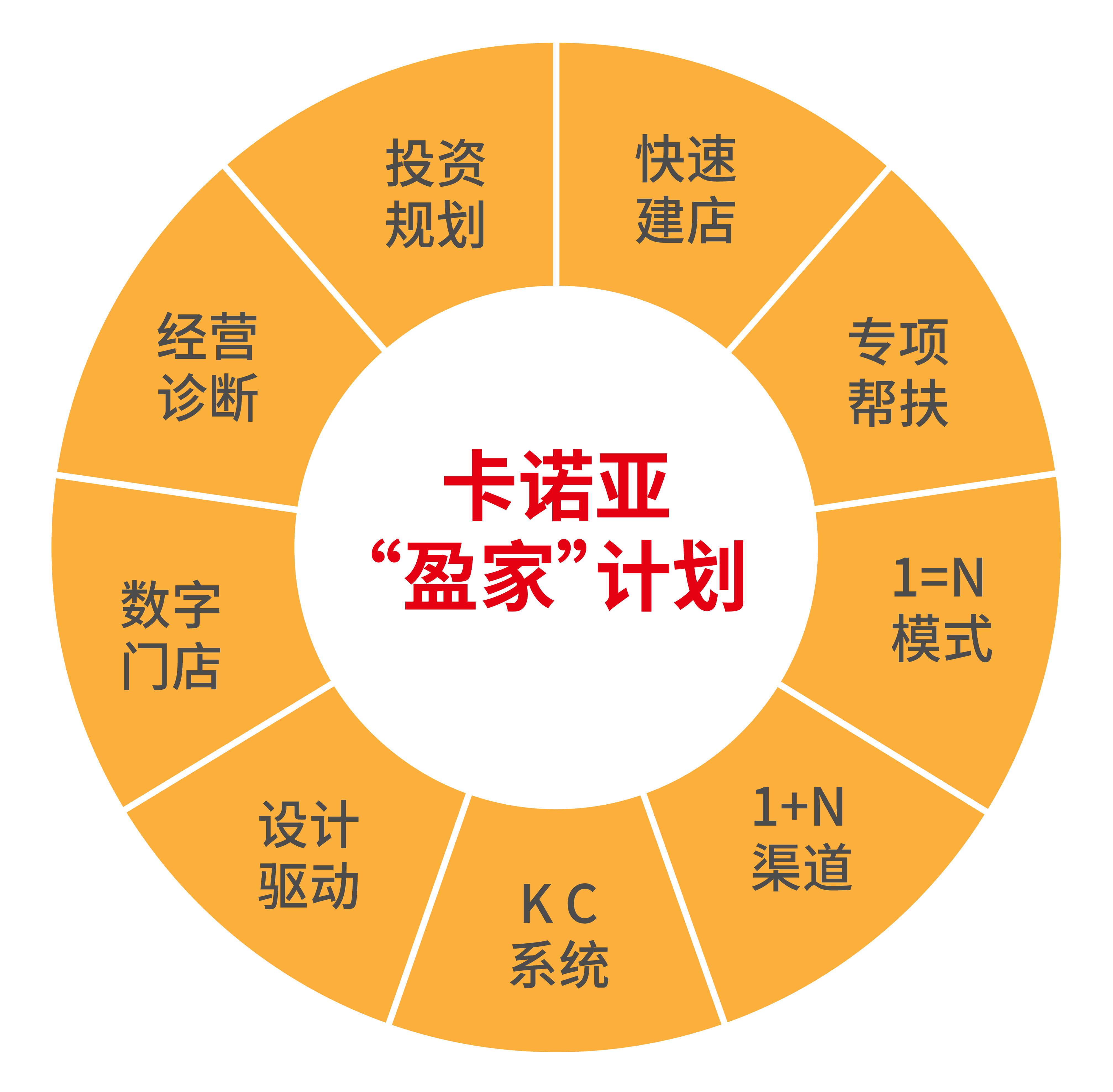 為了在全國范圍內布局更大的市場,卡諾亞提供“盈家”計劃幫扶體系,全面賦能經銷商,推出投資規劃、快速建店、專項幫扶、1=N模式、1+N渠道、KC系統、設計驅動、數字門店、經營診斷等支持政策,從選址、裝修補貼到開業、運營管理,從全崗位培訓到營銷活動策劃支持,卡諾亞提供一系列規范化的幫扶體系,貫穿經銷商的整個成長過程,幫其快速掌握定制家居專賣店運營知識,實現快速上手、快速開店。