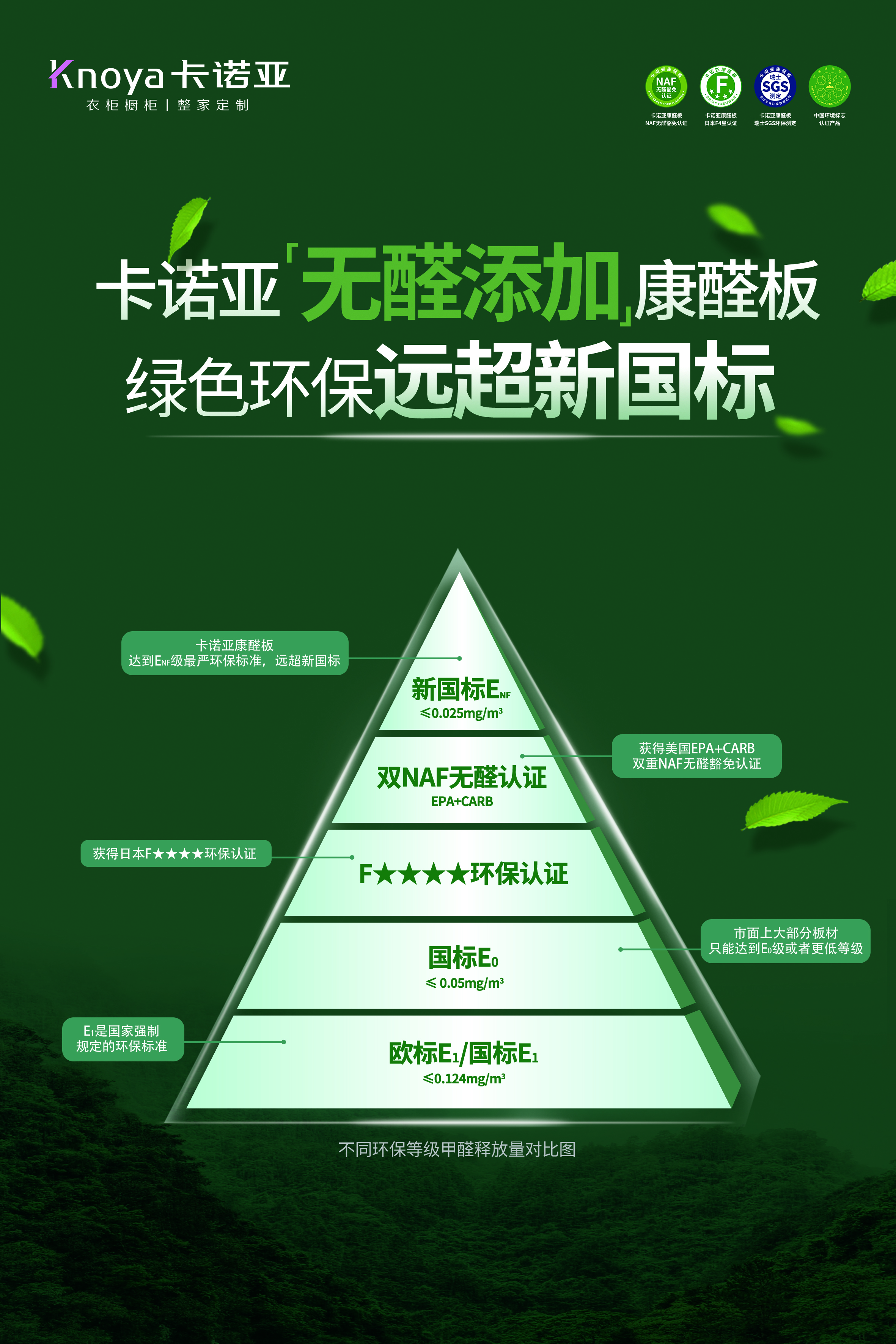卡諾亞除了在生產端融入綠色發展基因,還在消費端積極引導普及綠色環保家居理念。在全國近千家品牌專賣店,卡諾亞大力普及高顏高品康醛整家套餐,以更具性價比的優勢,讓健康家居走進更多的家庭。基于消費者對環保健康的高需求,卡諾亞康醛整家套餐選用的是達到新國標最高環保等級ENF級的康醛板,甲醛釋放量≤0.025mg/m³,可大面積使用于室內,不僅以無醛添加更環保、握釘力強更耐久、靜曲強度高更牢固等優勢,刷新了消費者對于環保板材的認知,更獲得美國雙NAF無醛豁免認證+日本F★★★★環保認證+瑞士SGS權威認證,卡諾亞用國際品質、本土價位推廣普及環保家居,依靠無醛添加的高品質產品,帶來一種更加健康和綠色的高品質生活。